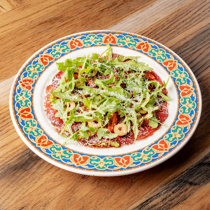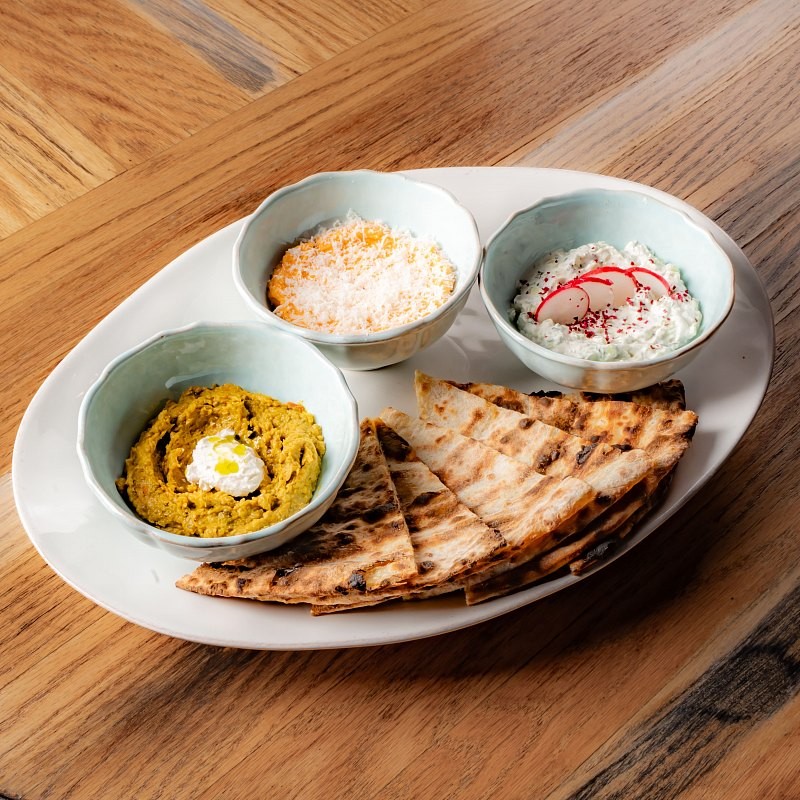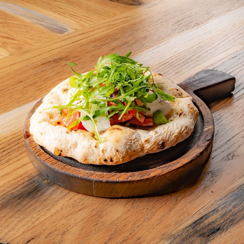 Фокачча из дровяной печи с узбекскими помидорами, пряной рукколой и домашней Моцареллой