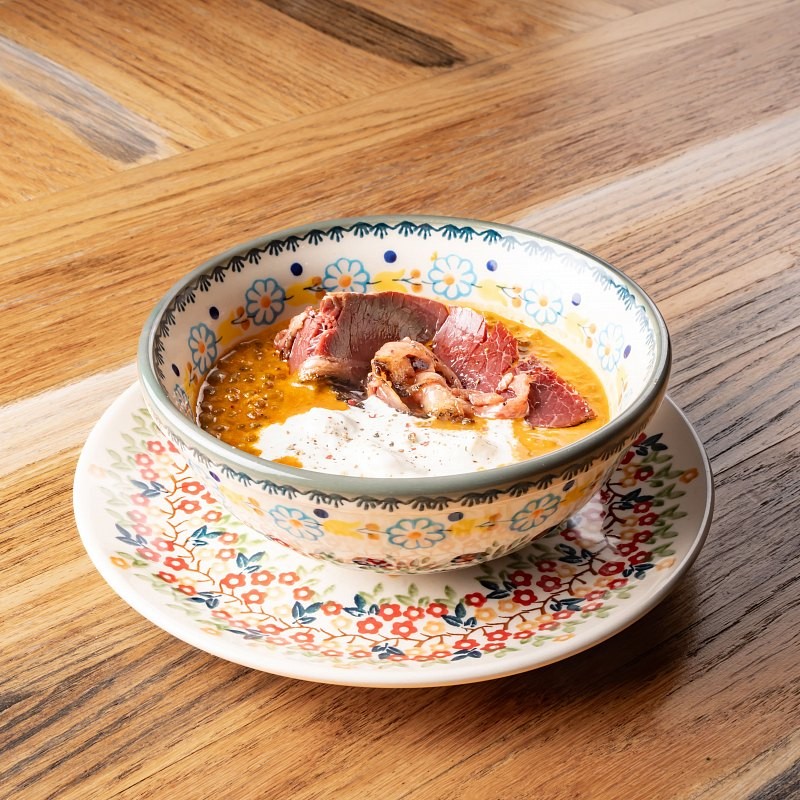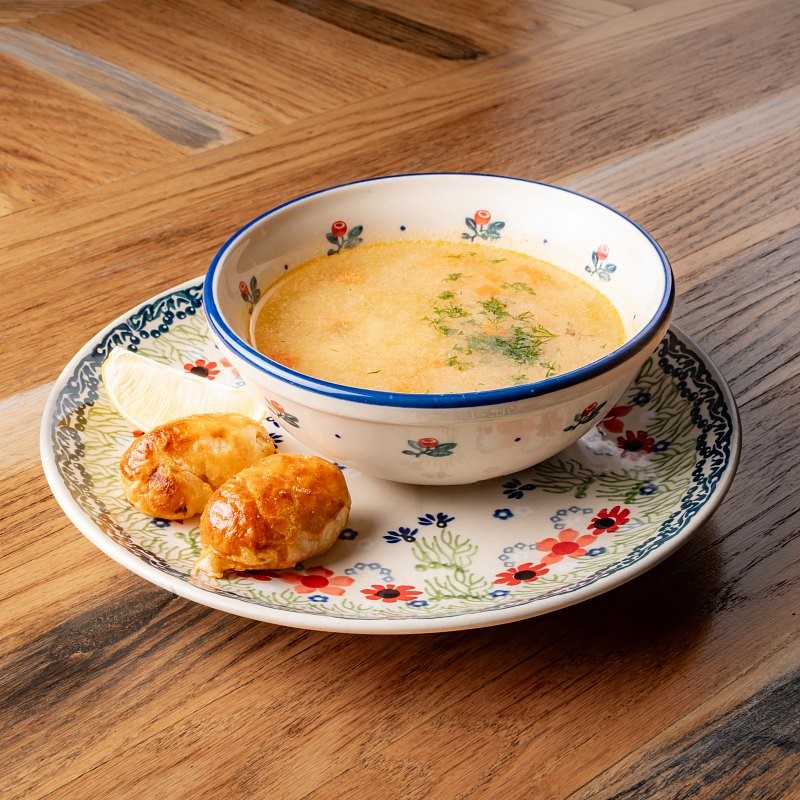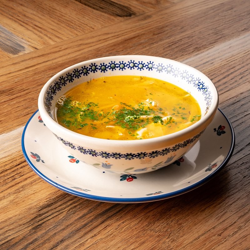 Бульон с нежным куриным филе, домашней лапшой, овощами и зеленью