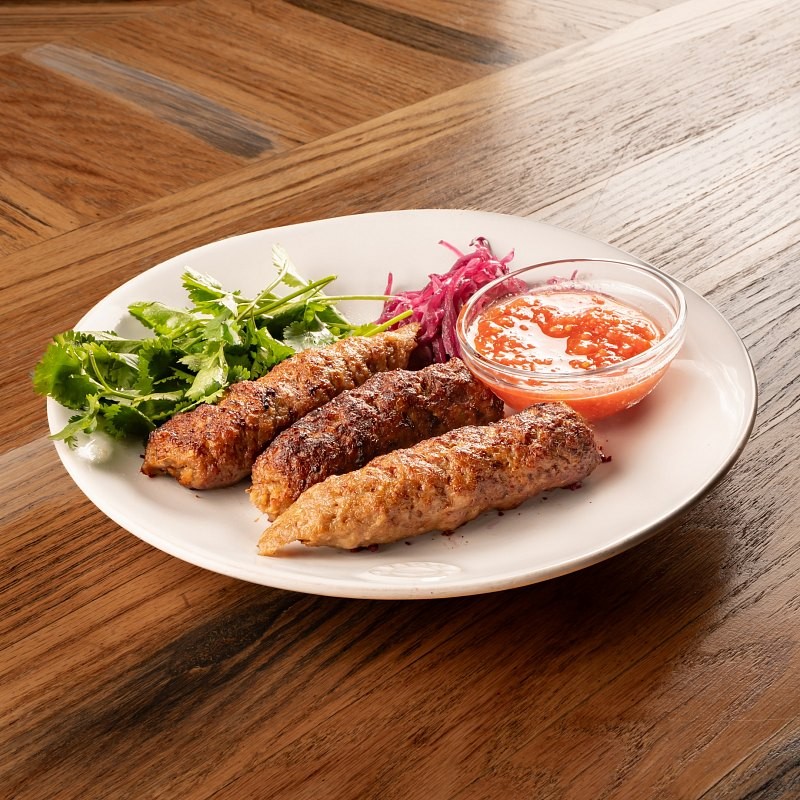 Фарш из баранины, курдюк (бараний жир), баклажан на гриле, перец болгарский на гриле, томат, красный лук с зеленью. Подается с кинзой и аджикой