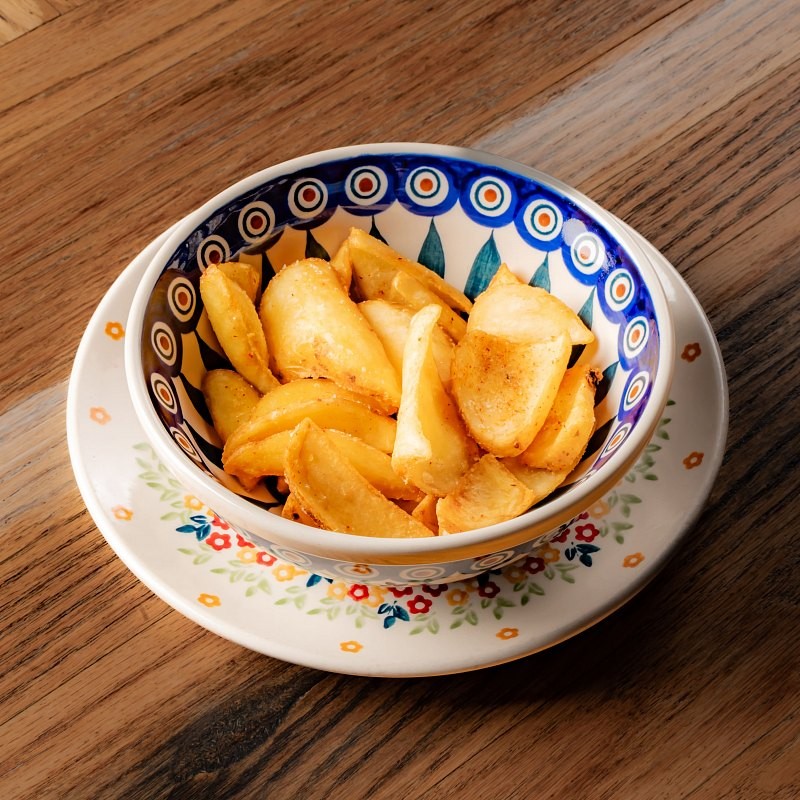 Обжаренные дольки картофеля с луком и ароматной зеленью