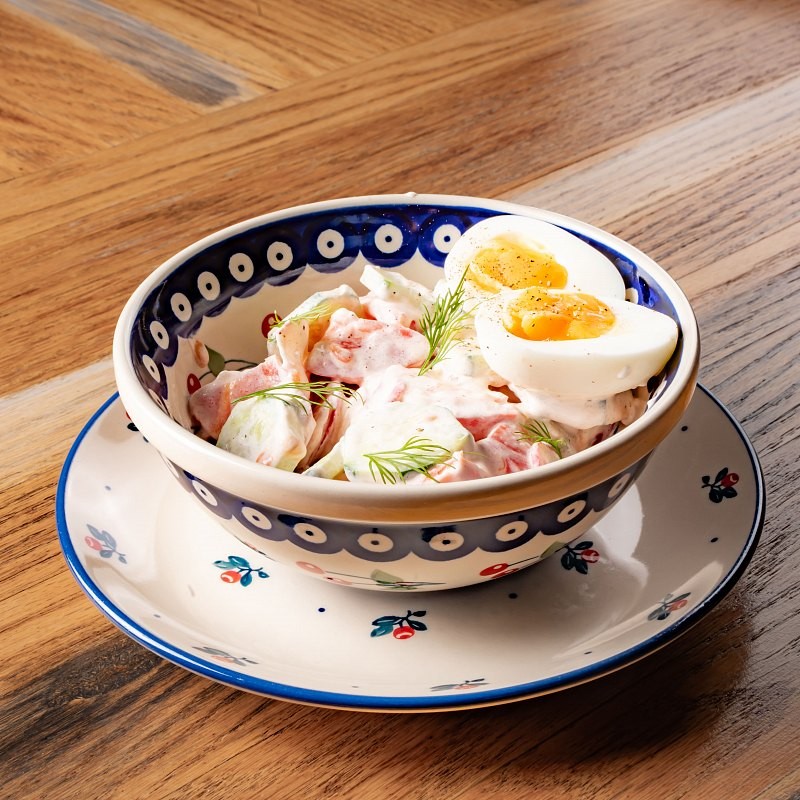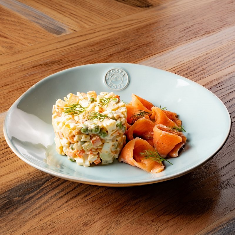 Салат оливье с нежным слабосоленым лососем и молодым зеленым горошком