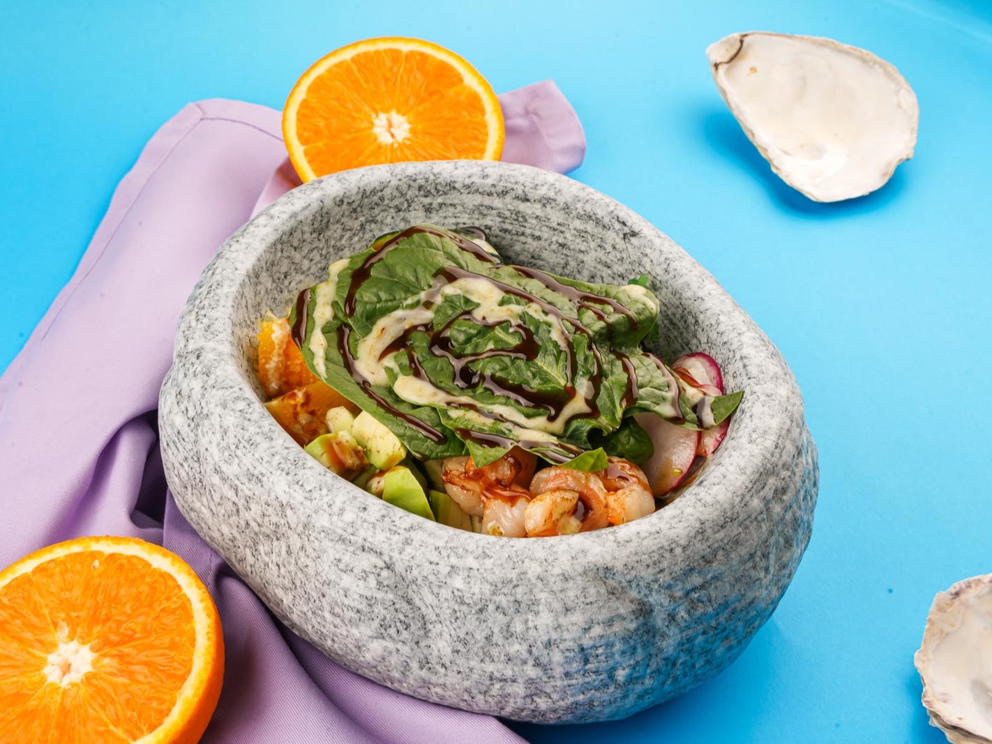 обжаренные креветки, мякоть авокадо и грейпфрута, свежие огурцы, редиска, шпинат, лаймовый соус 160гр