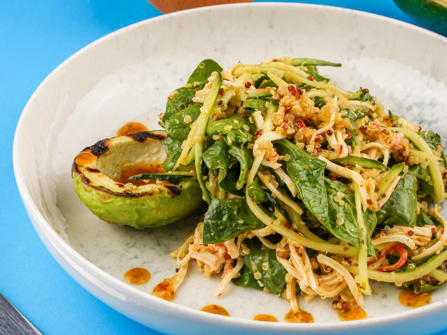 киноа, мясо свежего краба, шпинат, соус манго-чили, обжаренное авокадо на гриле 250гр