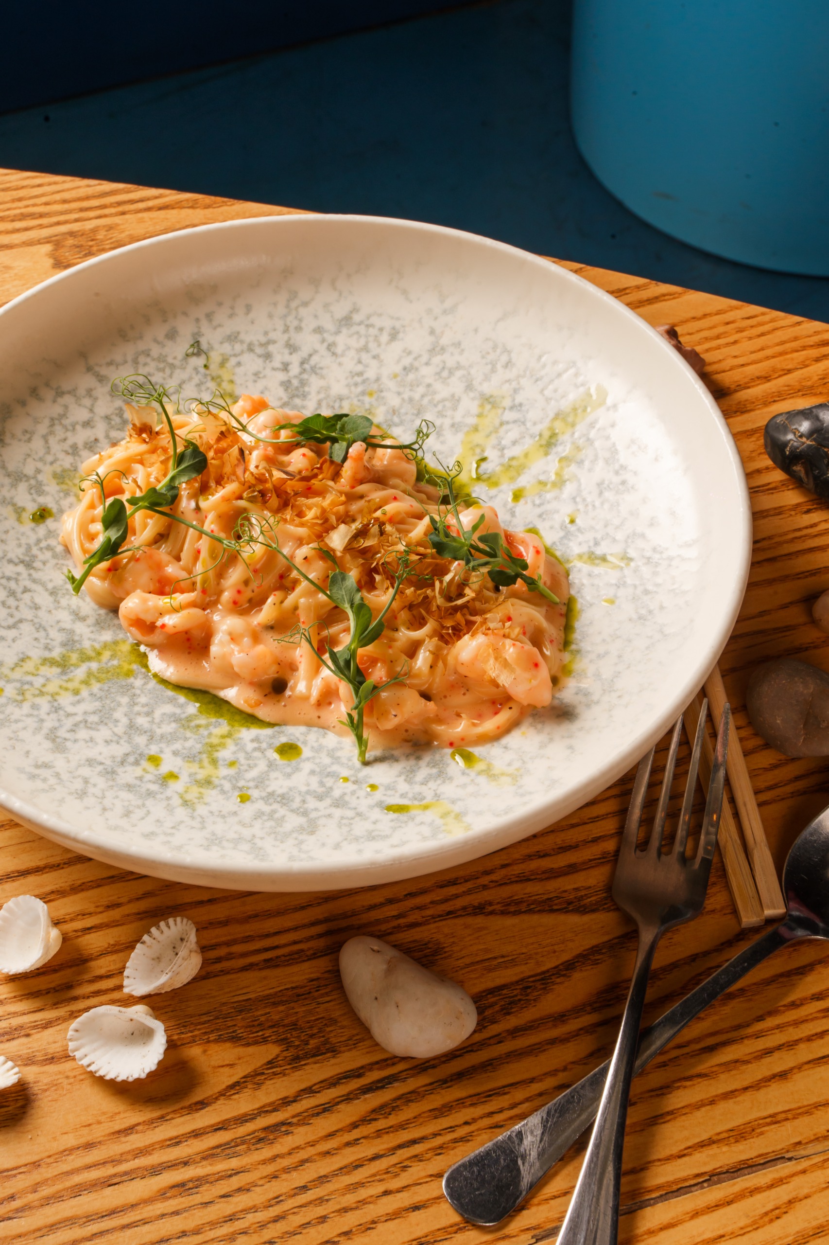 Паста лингвини, тигровые креветки, икра тобико, тунец, соус карбонара.