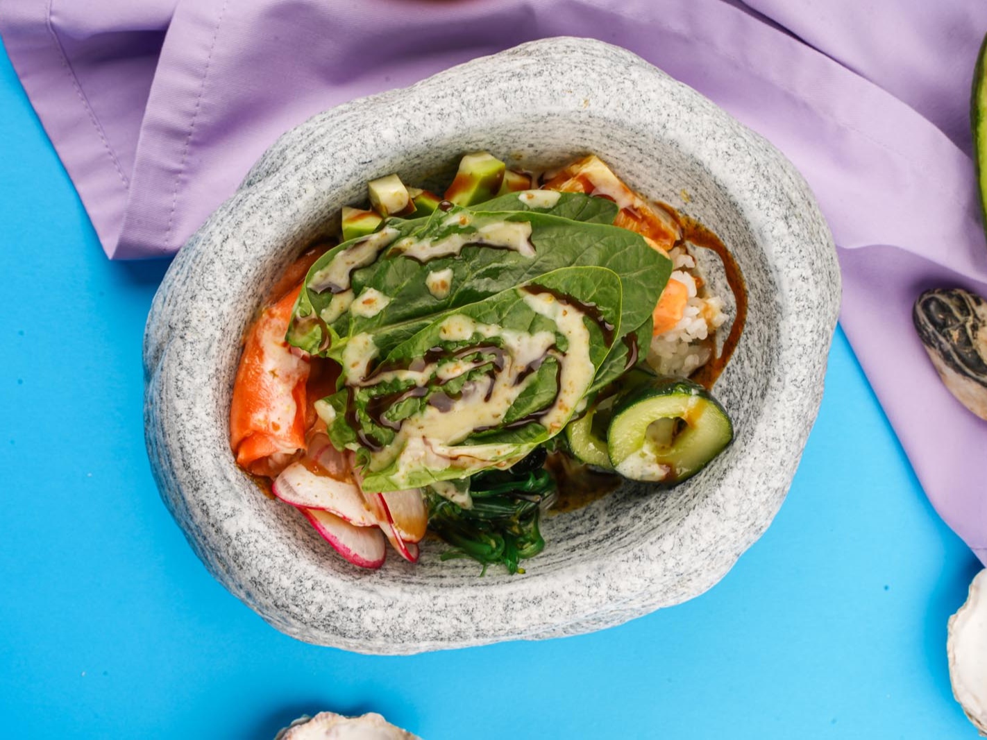 Рис, киноа, креветка, водоросли чука, редиска, мякоть апельсина, соус унаги, ореховый соус.