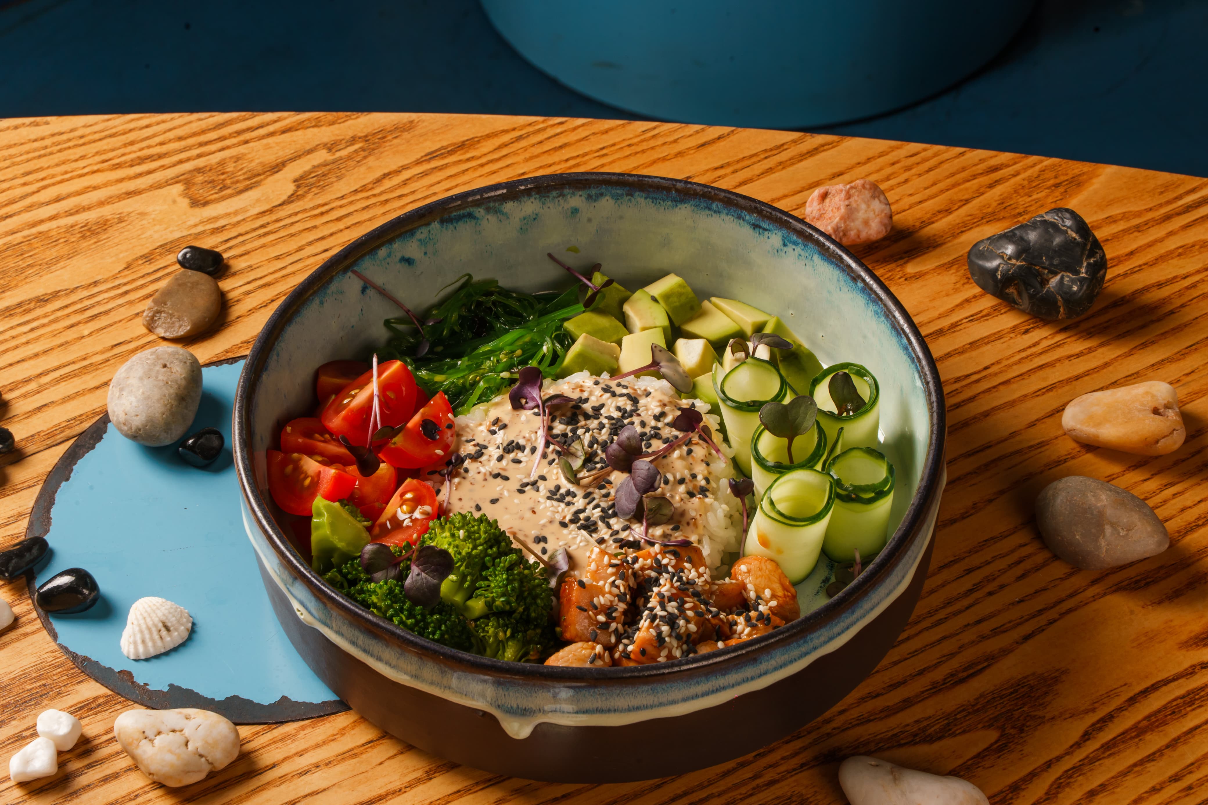Куриное филе в сочетании с авокадо, водоросли чука, японским рисом, брокколи, черри. Заправленный соусом терияки и ореховым соусом 370гр