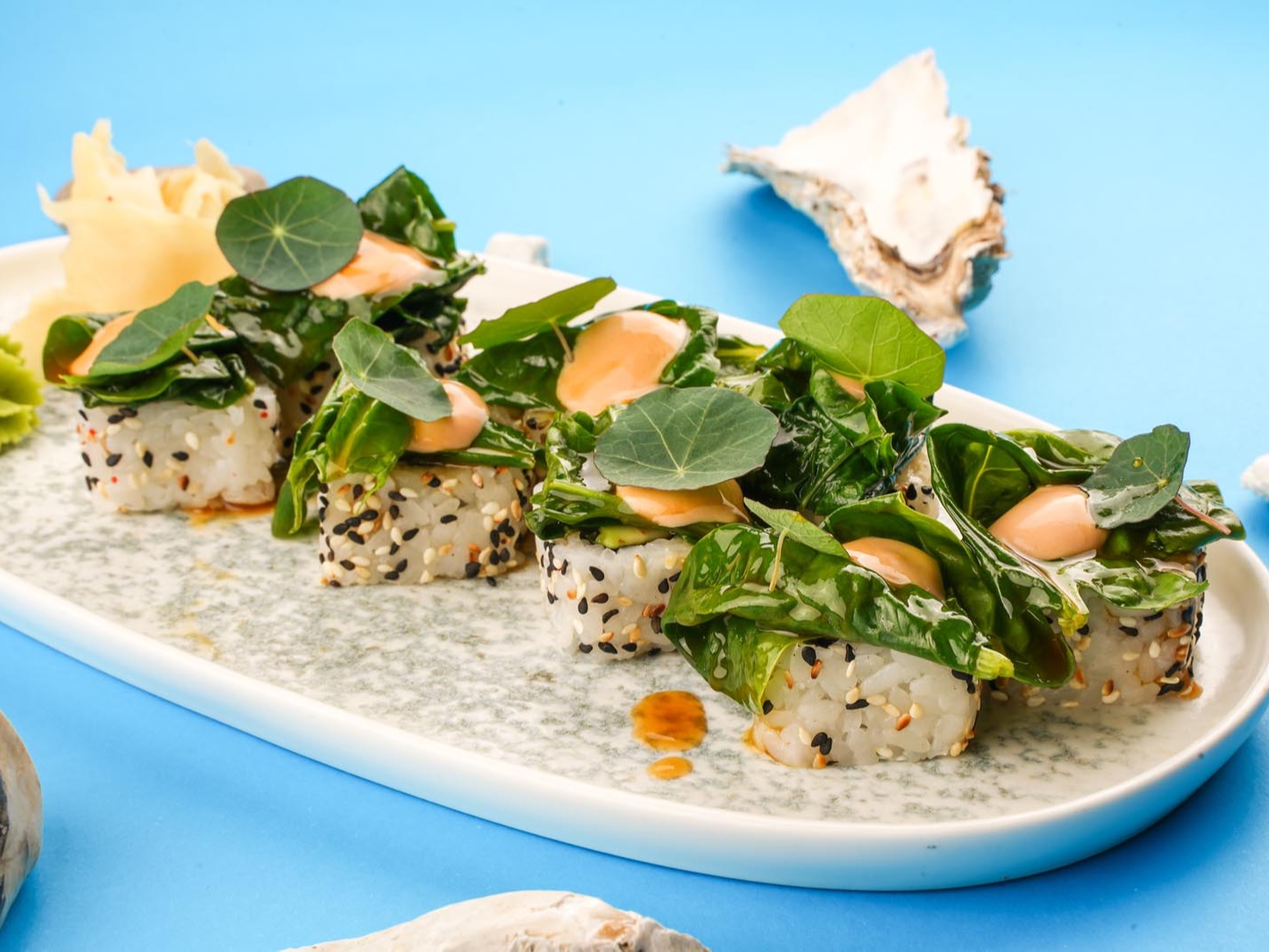 рис, авокадо, креветка в кляре, творожный сыр, шпинат, притушенный в устричном соусе 200гр