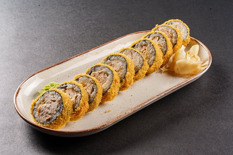 Роллы из Японского риса в хрустящей панировке с куриной грудкой и фирменным соусом. Подаются рооллы с ореховым Японским соусом Гамадари