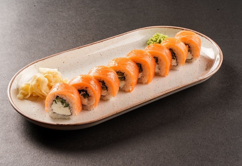 Нежный сливочный сыр с огурцами и зеленым луком закручивается в рис, сверху выкладывается свежий лосось. Подается с имбирем, васаби и салатом из дайкона