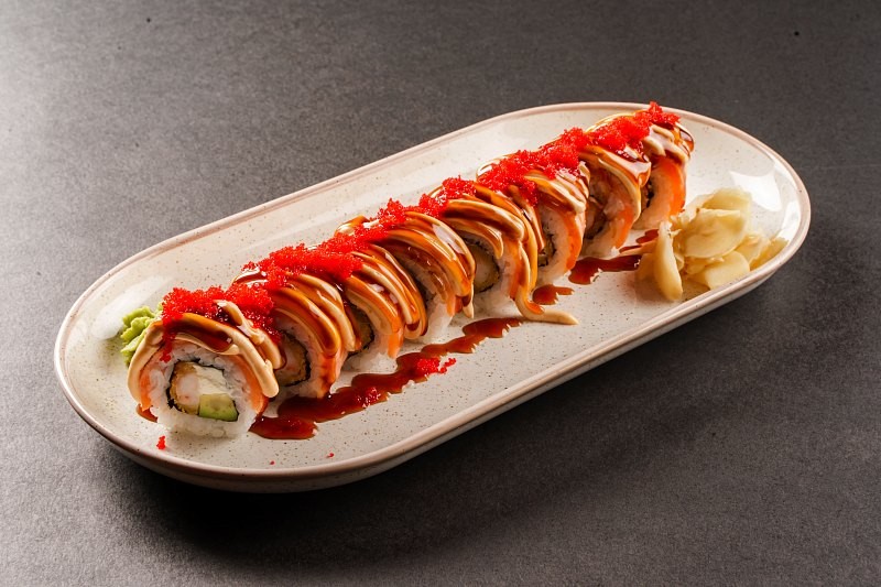 Креветка в панировке, авокадо и сливочный сыр, Японский рис, свежий опаленный лосось. При подаче поливается спайс соусом, унаги, украшается икрой тобико
