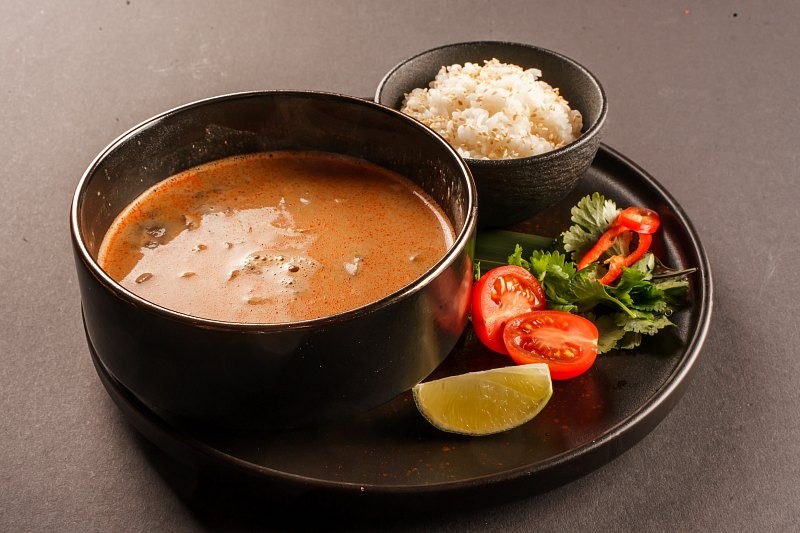 Фирменный суп на основе сливок, кокосового молока и пасты том ям. Подается с креветками, мидиями, шампиньонами рисом и кинзой. 400 гр